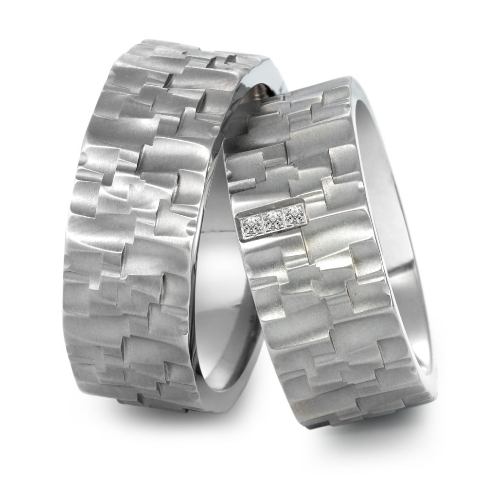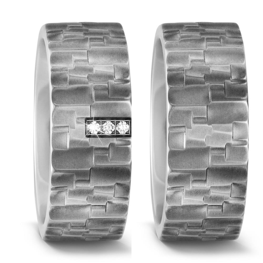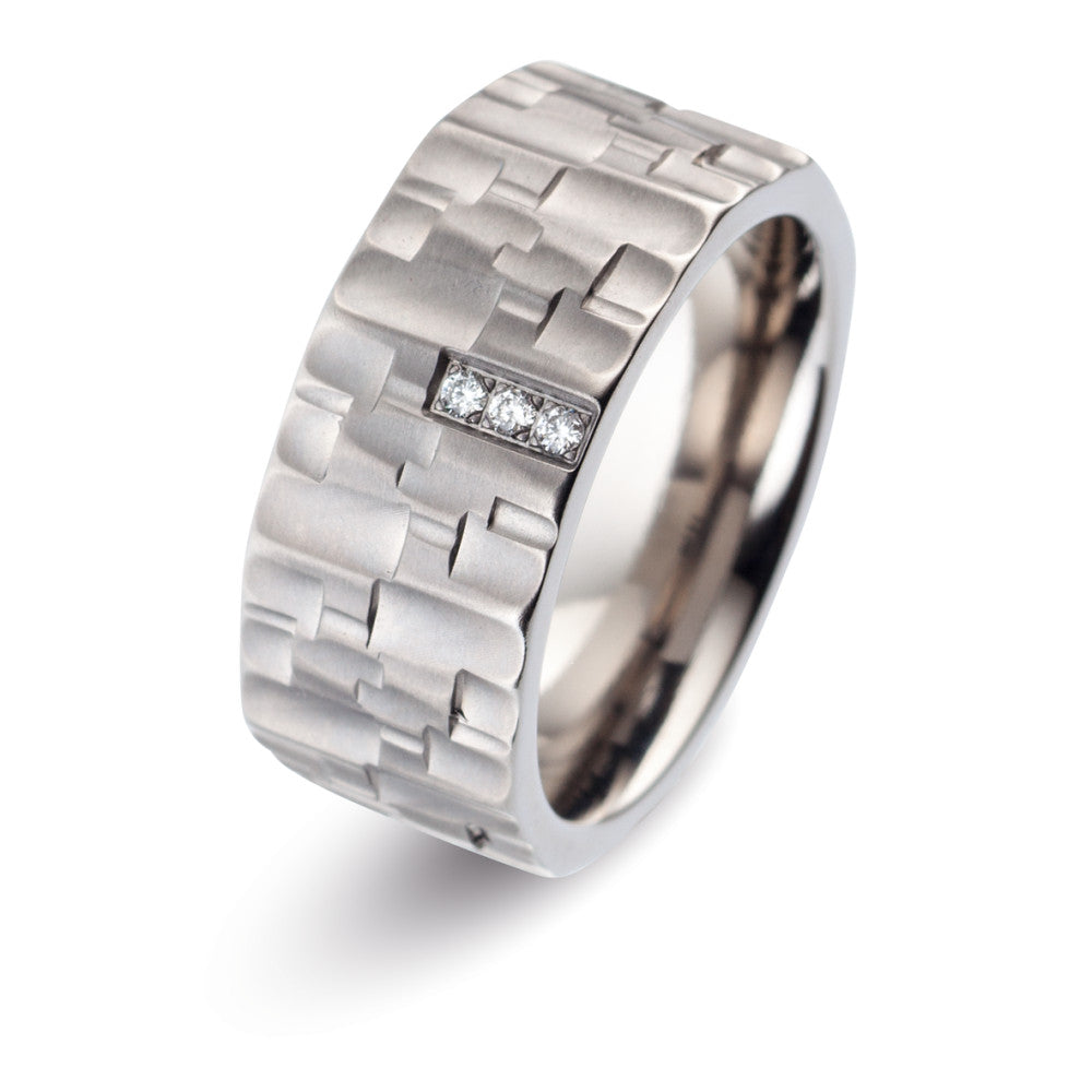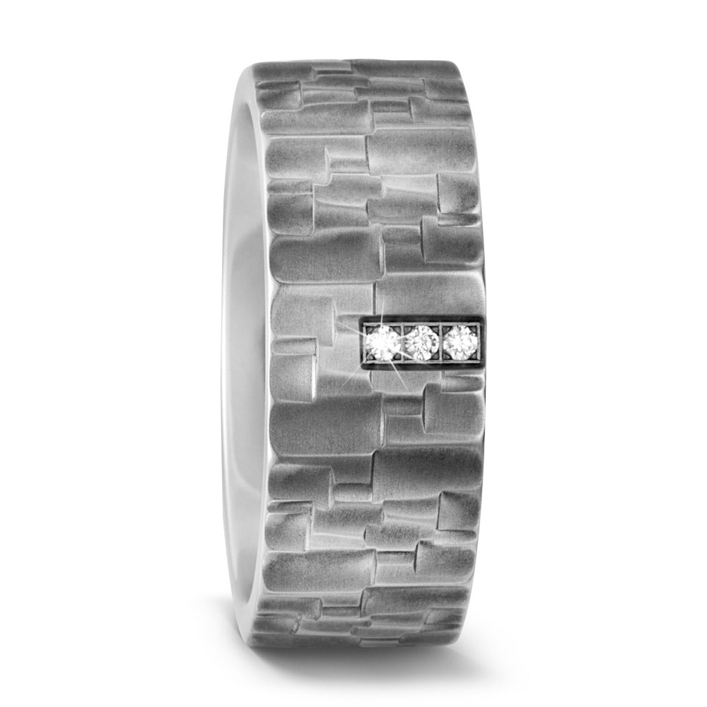 Eleganter Damen-Partnerring aus robustem Titan mit dekorativ strukturierter Oberfläche. Drei funkelnde Diamanten setzen edle Akzente und verleihen dem Ring zeitlose Schönheit. Perfektes Symbol für Verbundenheit und Stil.