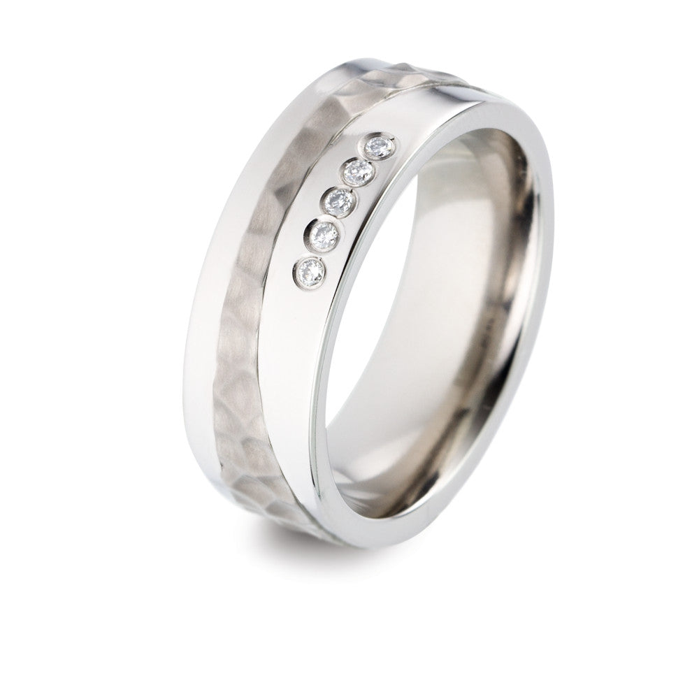 Eleganter Damens-Partnering aus robustem Titan mit edlem Hammerschlag-Design. Verziert mit fünf funkelnden Diamanten, vereint dieser Ring zeitlose Schönheit und besondere Bedeutung – perfekt für Paare, die Verbundenheit stilvoll zeigen möchten.
