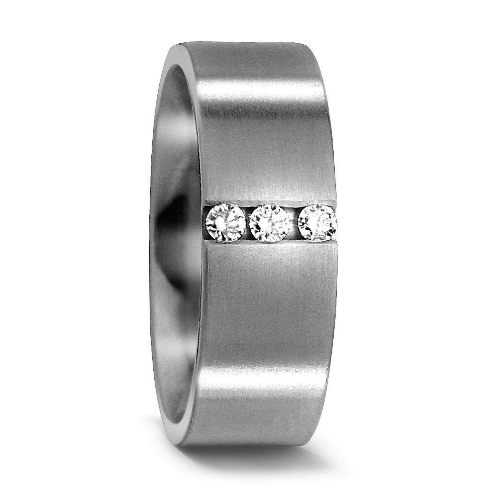 Eleganter Damen-Partnerring aus widerstandsfähigem Titan mit matter Oberfläche. Drei funkelnde Diamanten verleihen dem Schmuckstück zeitlose Eleganz und symbolisieren Verbundenheit. Ideal als modernes Zeichen der Liebe – robust, stilvoll und einzigartig.