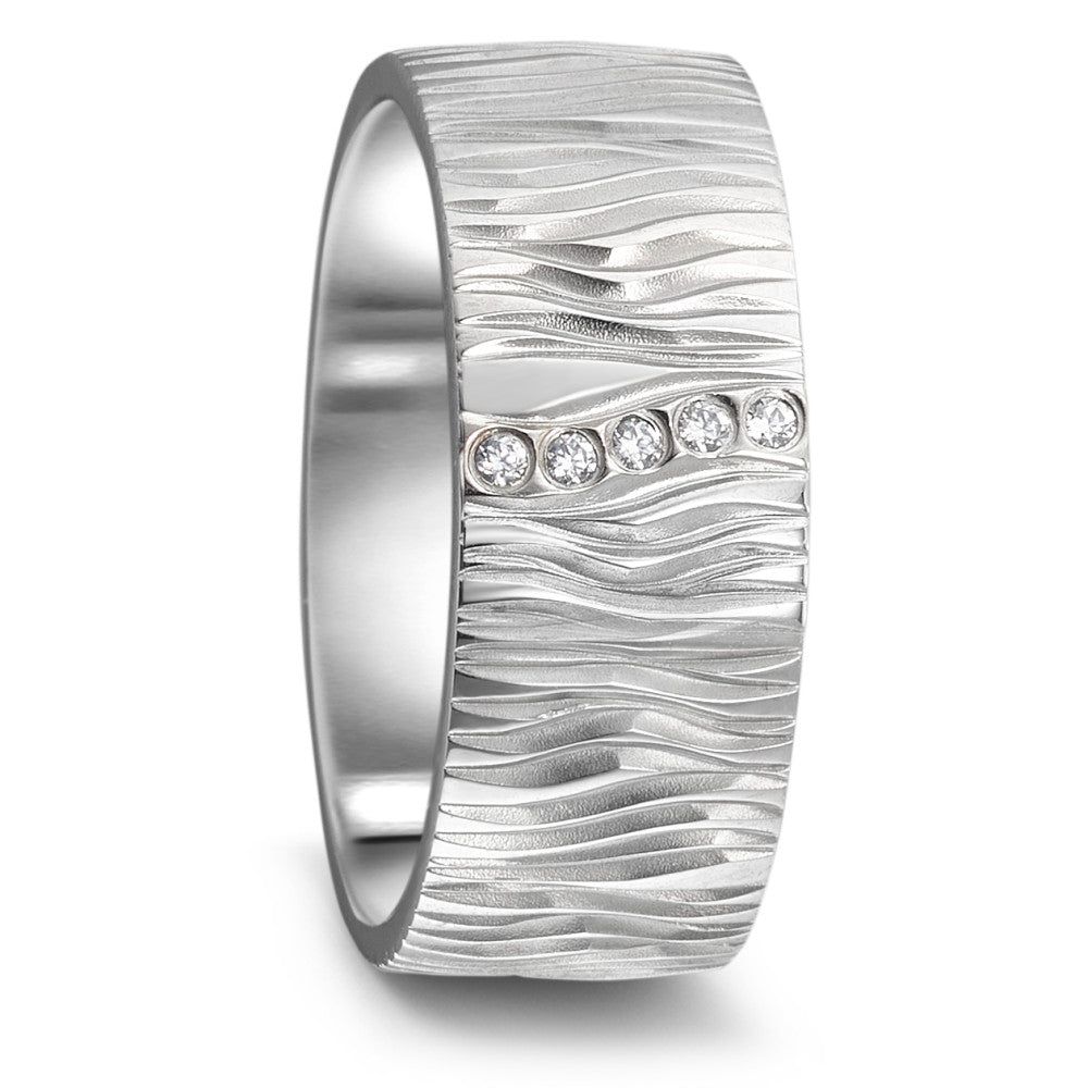 Eleganter Damen-Partnerring aus robustem Titan mit dezenter Wellenstruktur. Verziert mit fünf funkelnden Zirkonia-Steinen, die dem Ring einen edlen Glanz verleihen. Perfekt als Symbol für Ihre Verbundenheit – langlebig, modern und stilvoll zugleich.