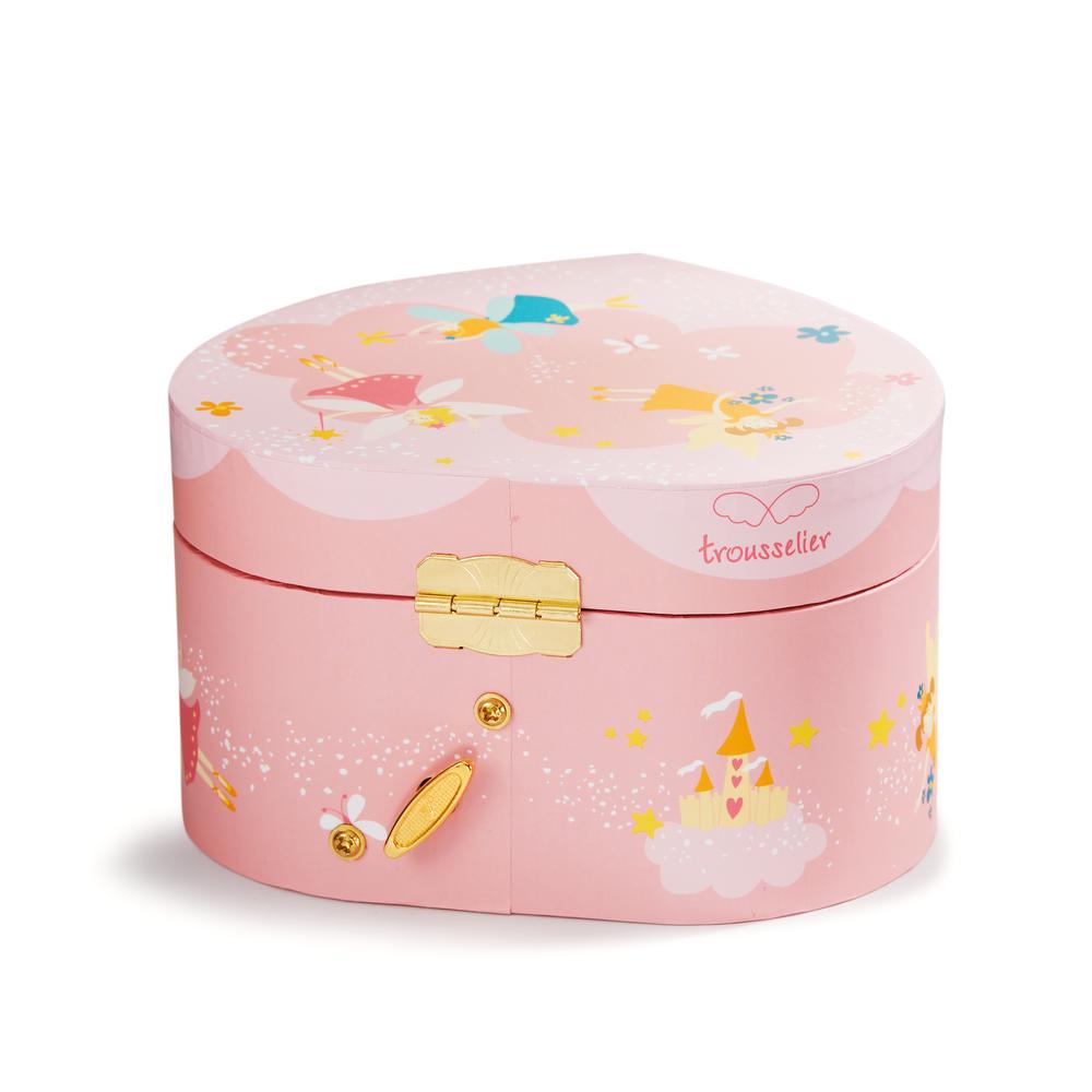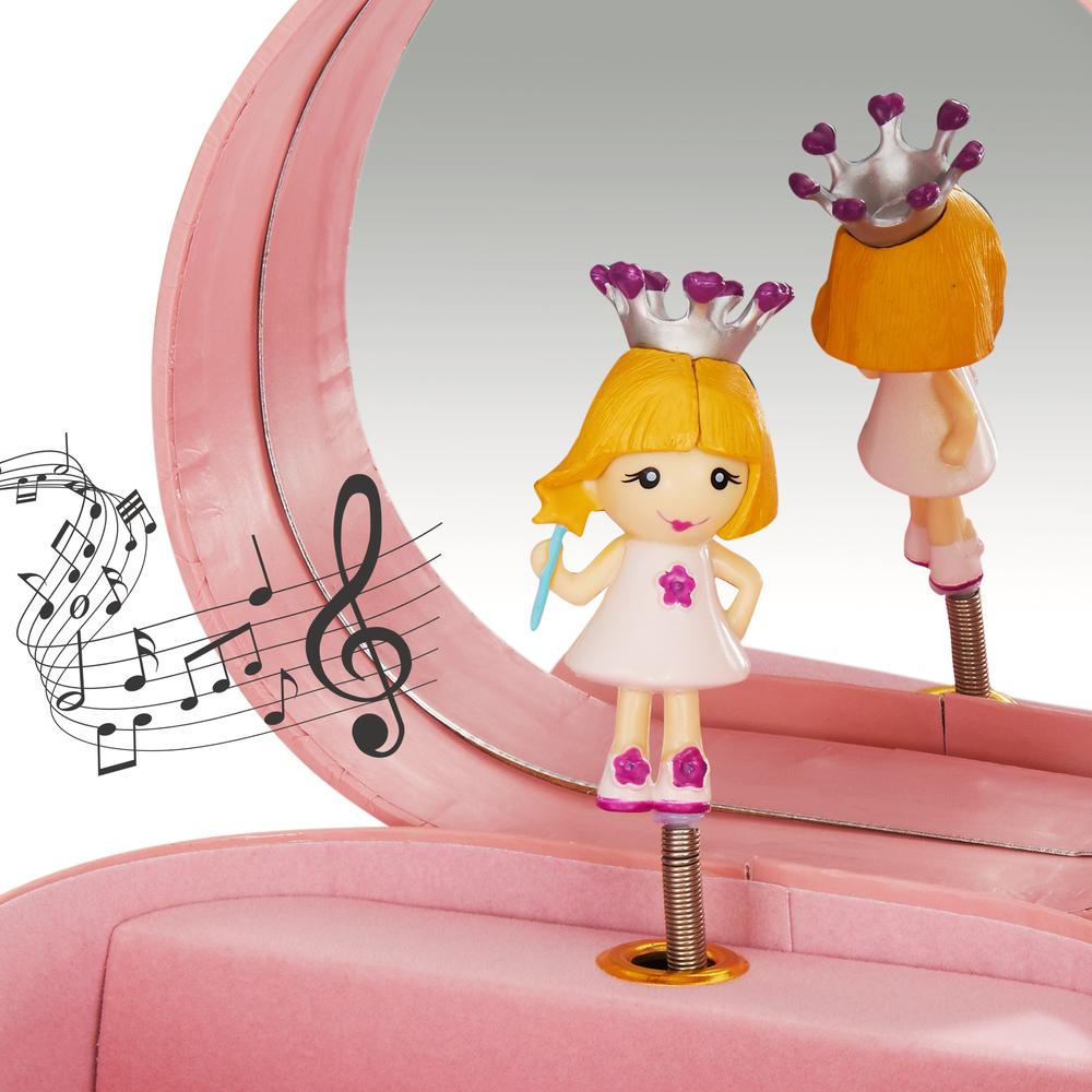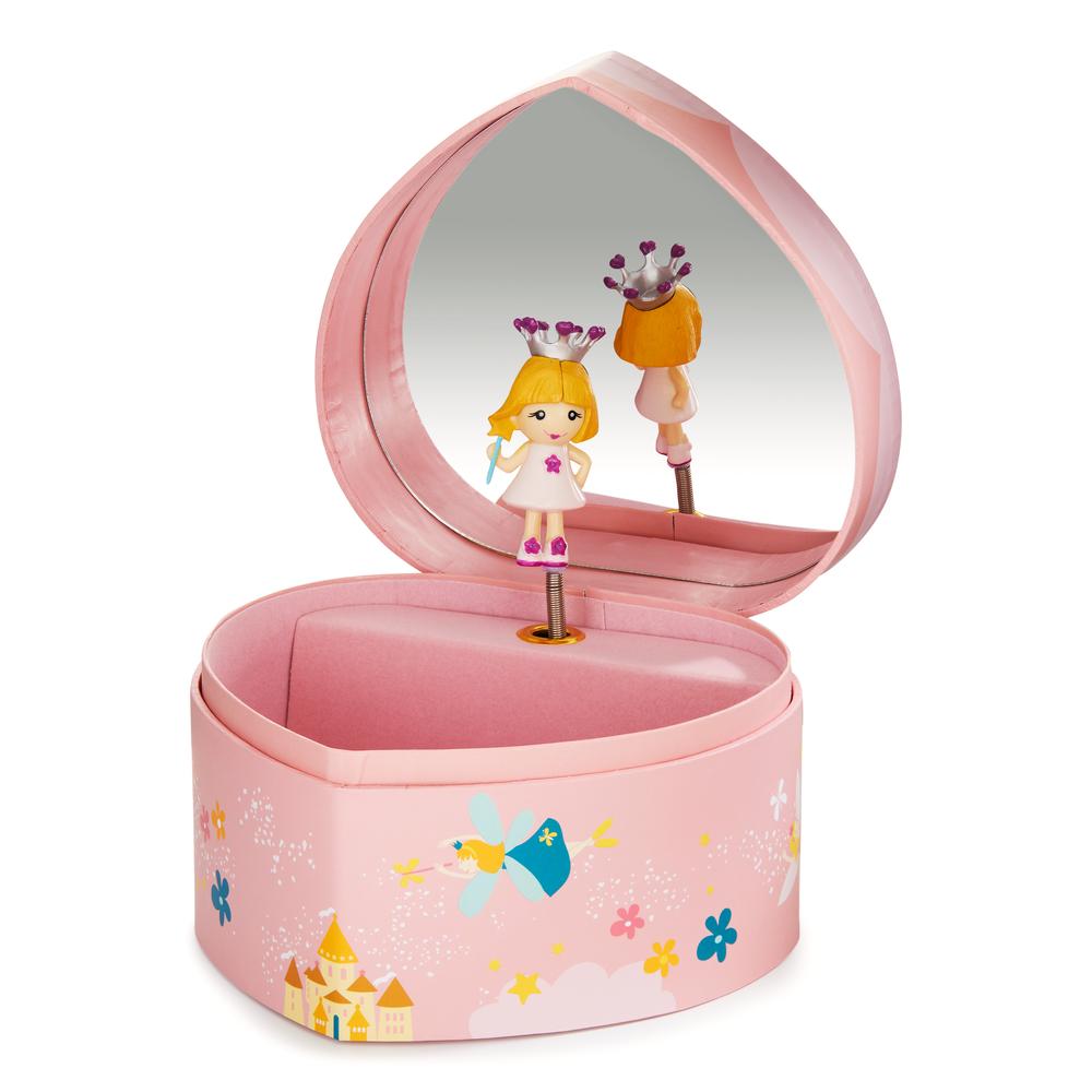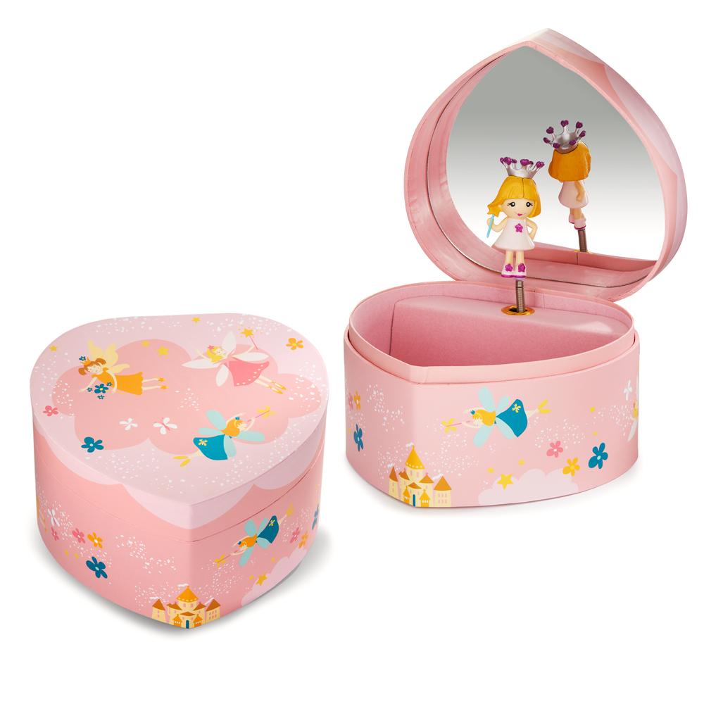 Zauberhafte Mädchen Schmuck-Schatulle in Herzform, rosa mit süssen Feen-Motiven. Innen mit Spiegel und drehbarer Prinzessinnen-Figur. Ideal zur Aufbewahrung von Schmuck und kleinen Schätzen. Perfektes Geschenk für kleine Träumerinnen! Masse ca. 13x12x7 cm.