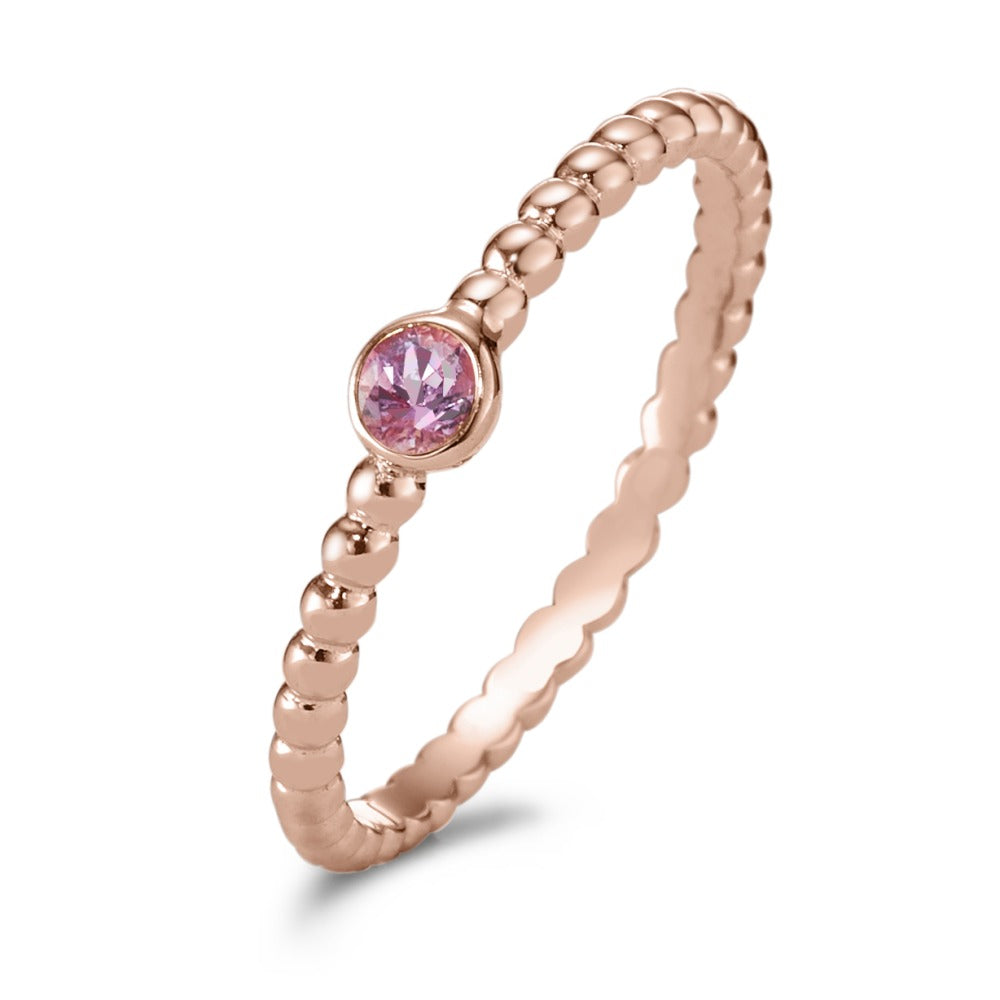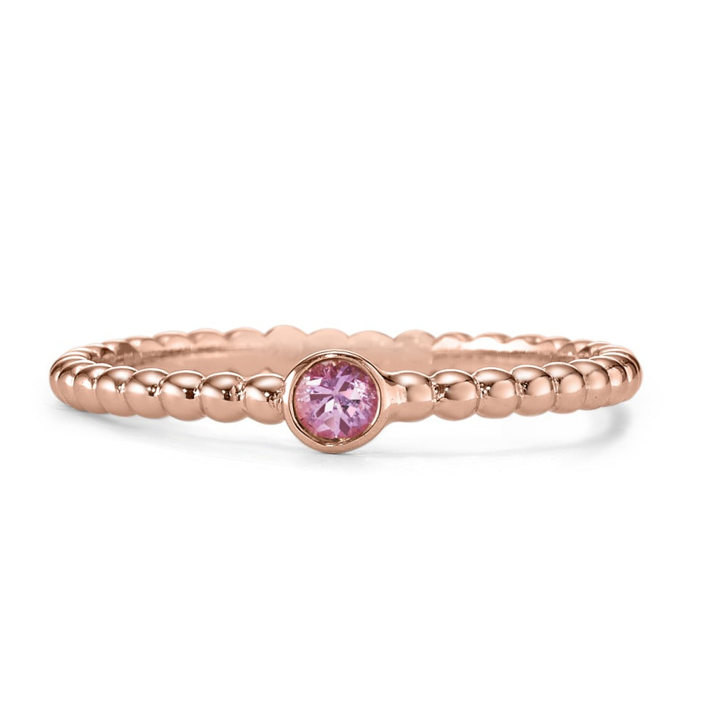Eleganter Damen-Solitärring aus 750er Rotgold mit bezauberndem pinkfarbenem Saphir. Das filigrane, kugelige Design macht diesen Ring zum perfekten Accessoire für jeden Anlass. Zeitloser Schmuck, der Eleganz und Stil harmonisch vereint. Ein besonderes Geschenk für besondere Momente.