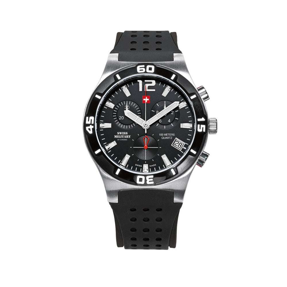 Sportliche Herrenuhr aus robustem Edelstahl mit schwarzem Zifferblatt und langlebigem Kautschuk-Armband. Wasserdicht bis 100 Meter, mit praktischer Datumsanzeige und Stoppfunktion. Perfekter Begleiter für Alltag und Freizeit – funktional und stylisch zugleich.