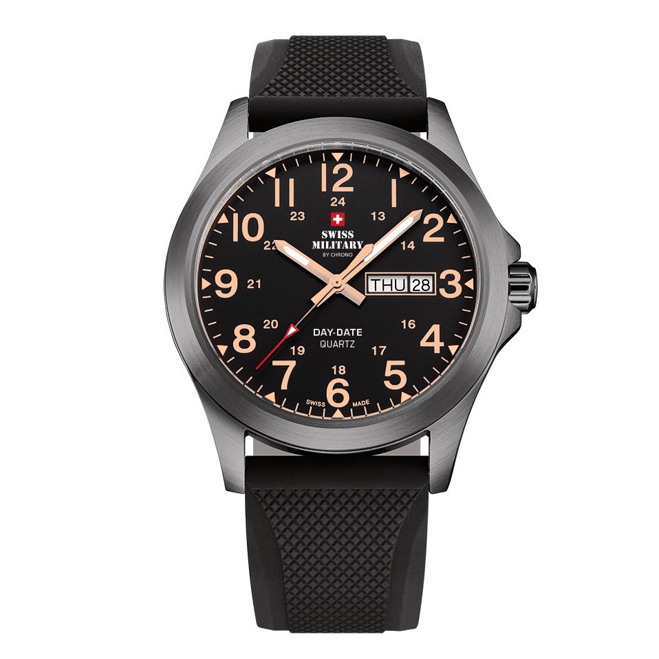 Robuste Herren-Armbanduhr aus Edelstahl mit langlebigem Silikonarmband. Das klare, schwarze Zifferblatt bietet eine gut ablesbare Tages- und Datumsanzeige. Perfekt für den sportlichen und eleganten Look im Alltag. Swiss Military Qualität für höchste Präzision und Zuverlässigkeit.